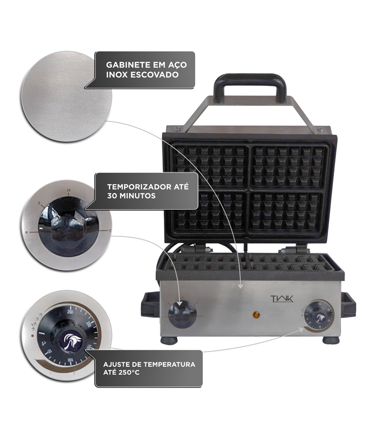 A Máquina para Waffle com Teflon - 4 Waffles Profissional The Waffle King foi desenvolvida para estabelecimentos que buscam alto desempenho, produtividade e qualidade superior. Com placas espessas que distribuem o calor de forma uniforme, este equipamento garante waffles perfeitos, consistentes e com excelente acabamento em todas as produções.