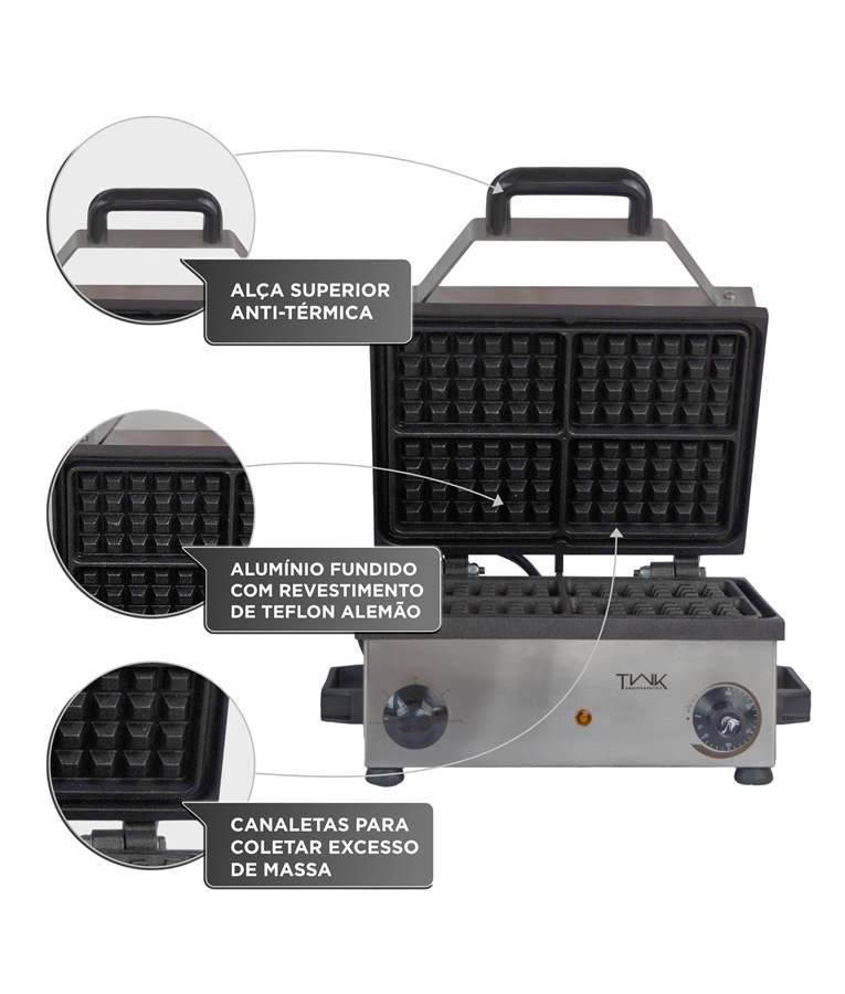 Máquina para Waffle com Teflon - 4 Waffles Profissional